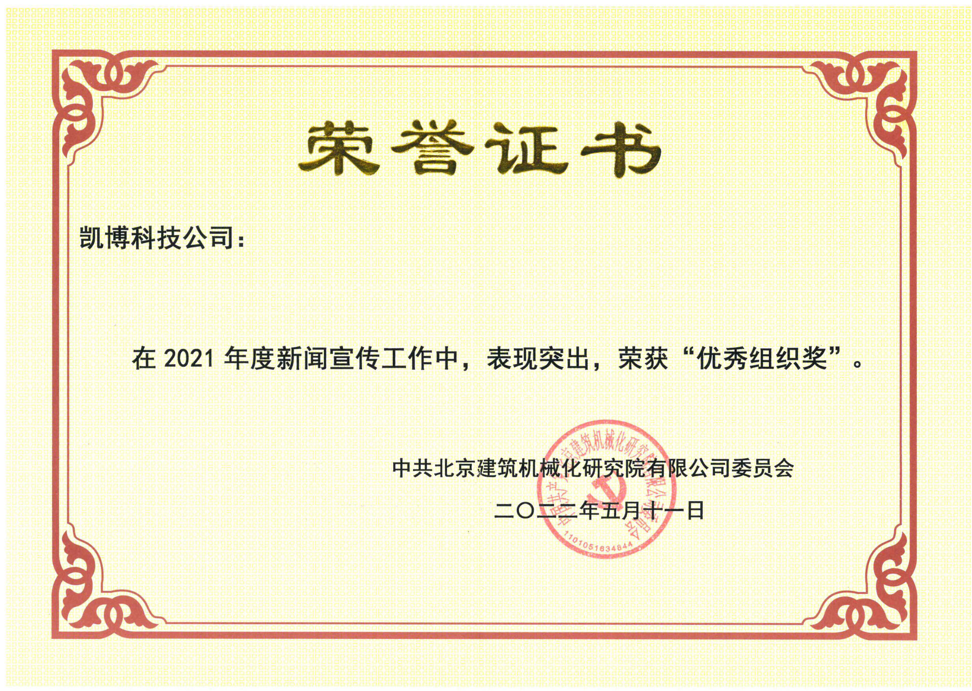 喜報!凱博科技榮獲北京建機院“新聞宣傳優秀組織獎”