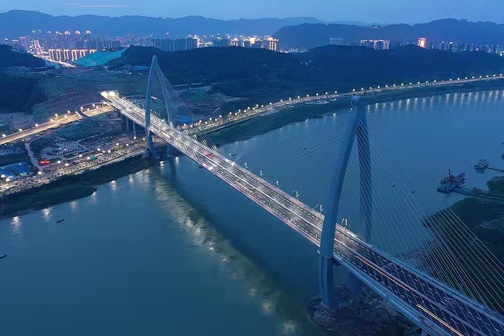 四川宜賓鹽坪壩長江大橋是宜賓市城市內環線的重要跨江節點工程,也是宜賓目前體量最大的橋梁。索塔是全國首次采用的“魚躍長江”造型,猶如一條躍出水面、向上飛騰的江魚。